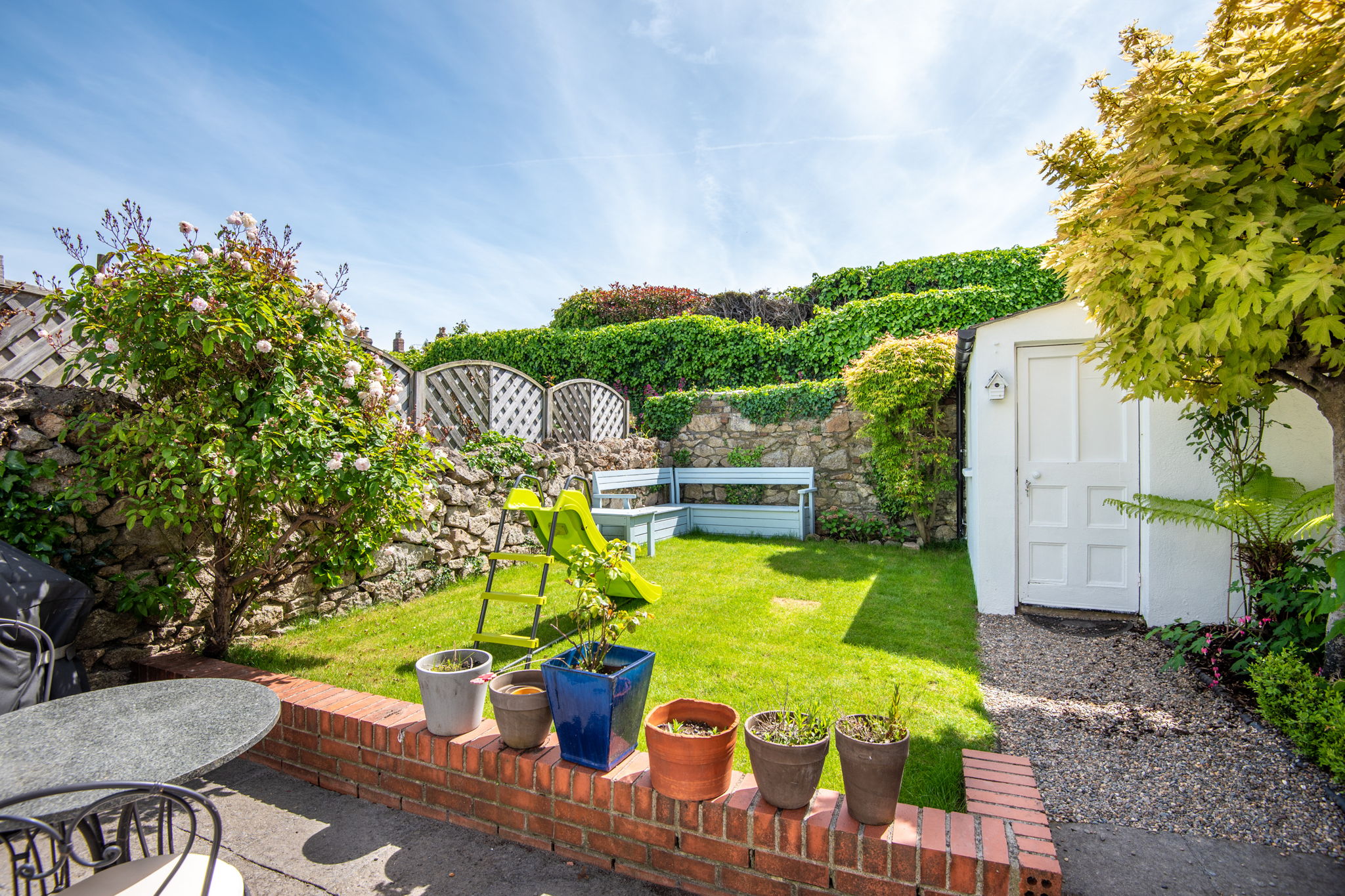 Low maintenance gravelled front garden railed with hedging. South facing rear garden with lawn, paved area, bedding with plants. Outhouse plumbed for washing machine and side entrance.