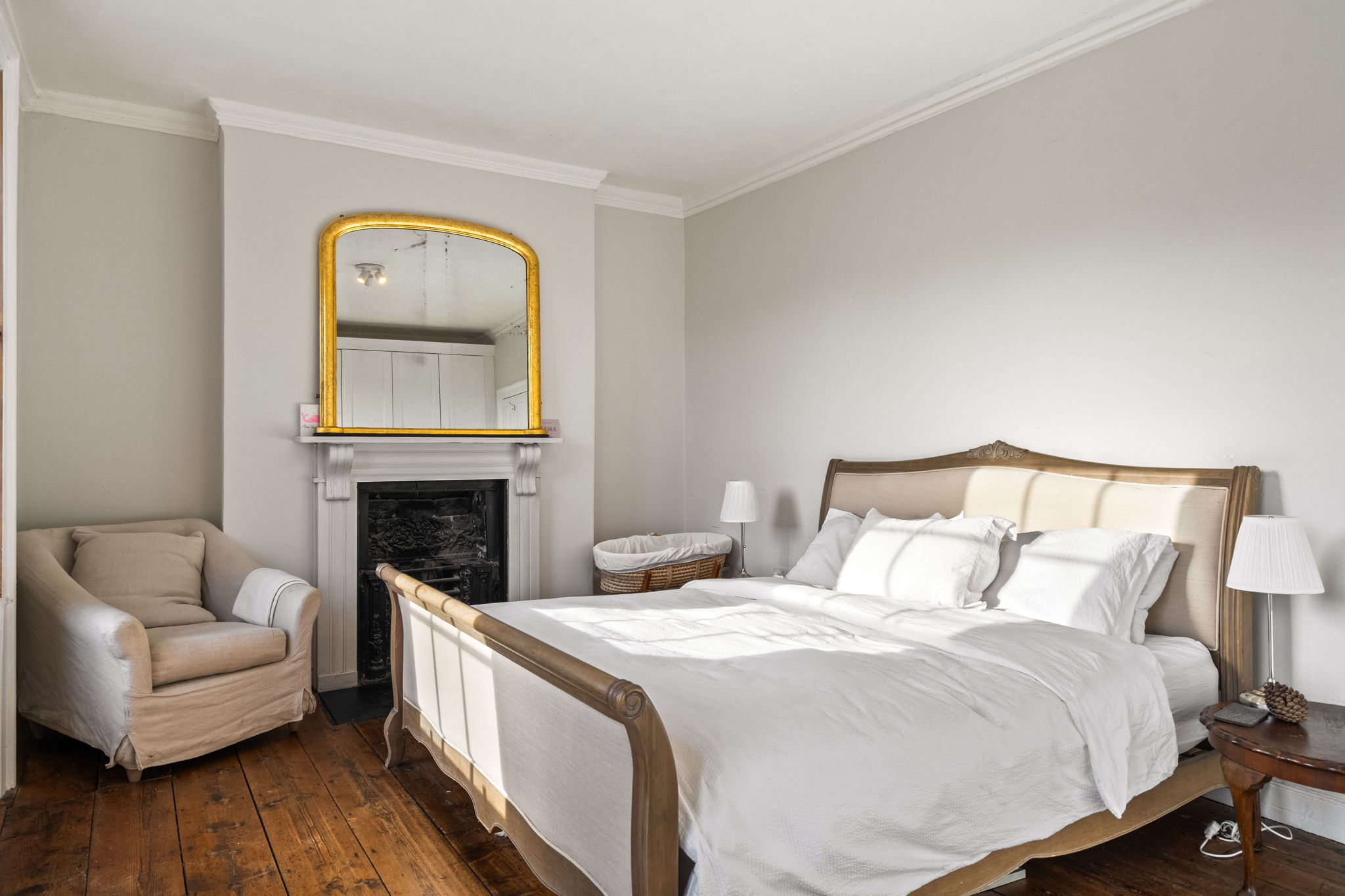 There are three bedrooms in total, and an attic room. The very bright main bedroom spans across the whole width of the house with its original floorboards. The current owners have also added bespoke fitted Joinery/wardrobe to the bedroom and retained the fully functioning fireplace. The walls have been painted in Slaked Lime Mid.