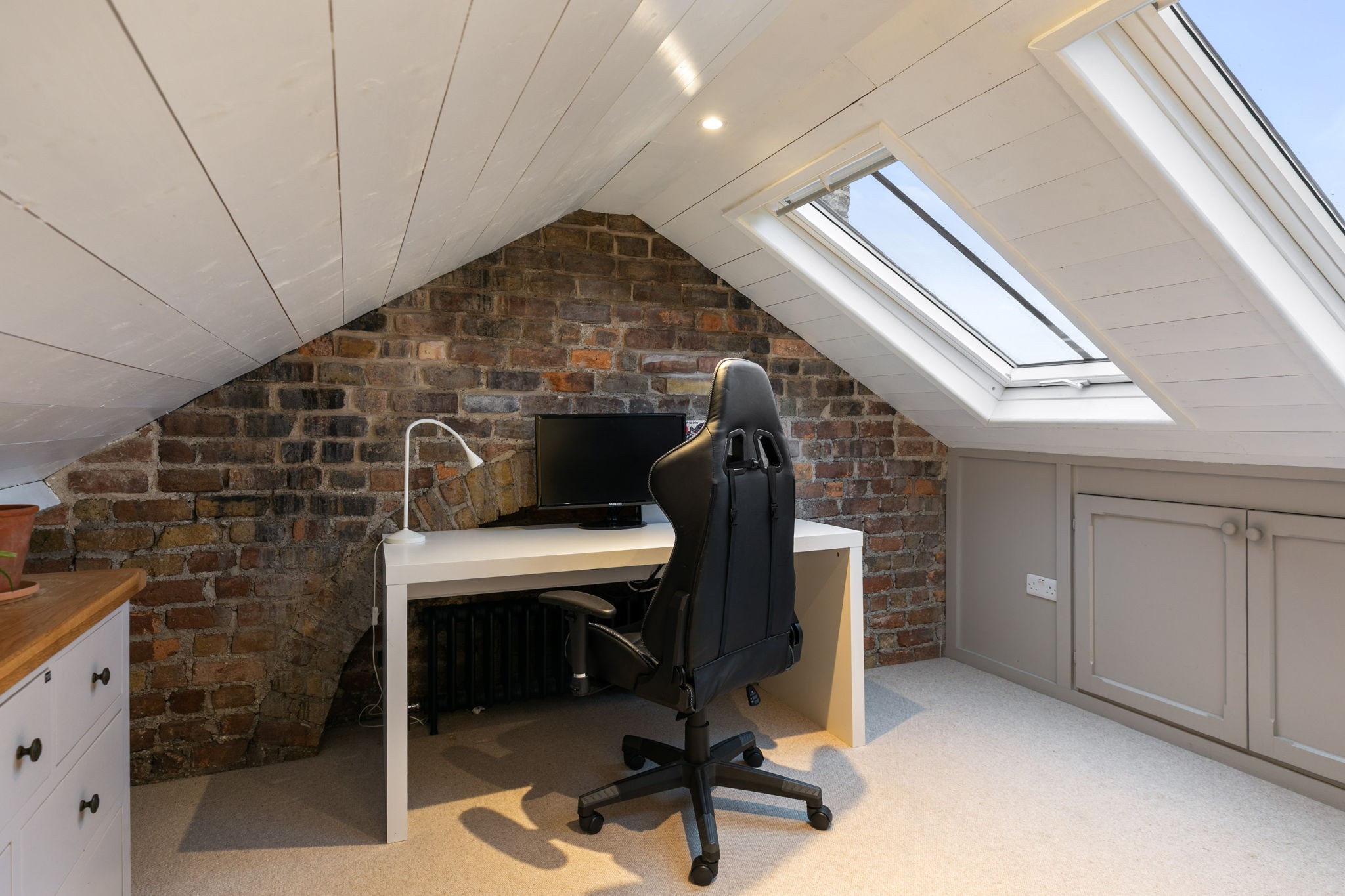 The First floor return bedroom has timber sashwindow offering a sublime and unique vista of the green dome of the church. Itopens up to a bathroom with oiled floorboards, a French sash opening to thegarden and dimmer recessed lights providing a soft ambiance for long soaks inthe free standing Albion Iso Enamel bath and a Burlington sink. The top floor room is currently used as a guest bedroom and a home office. It has maintained eaves storage with lighting. The large conservation Velux’s offer far reaching views over the roofs of the terrace, Lower Mount Pleasant Avenue and Mount Pleasant Square. It has are stored exposed brick wall and a Period Cast Iron radiator offering a lovely long lasting heat in the winter months.