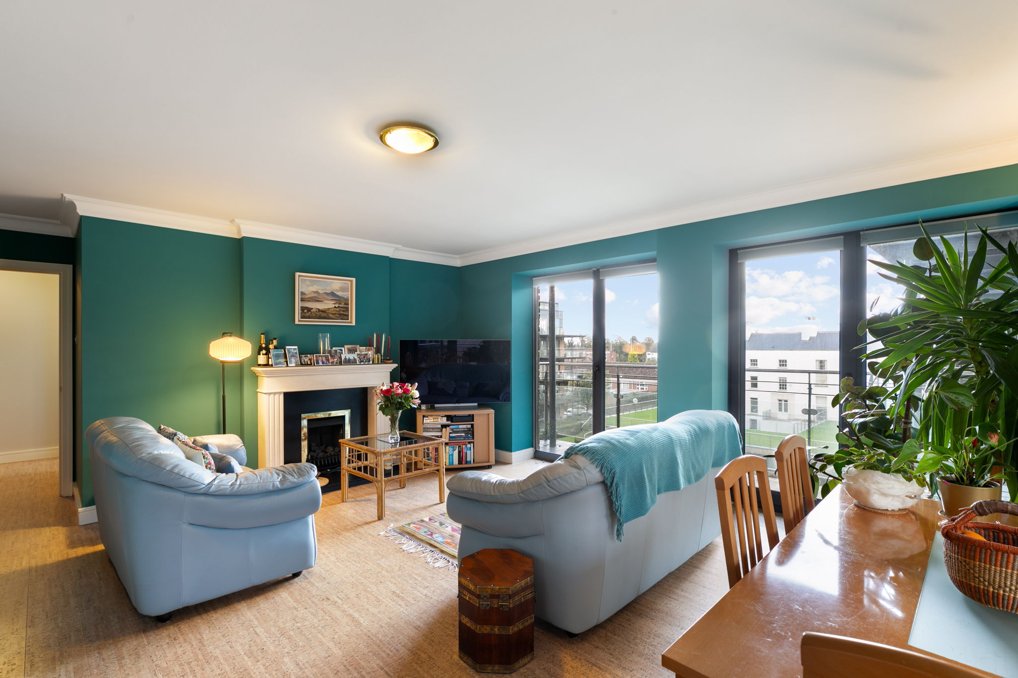 A bright corner living space with wrap around balcony and superb views down across the gardens, Cork flooring Mantlepiece with gas fire access out on to the superb corner wrap around balcony.