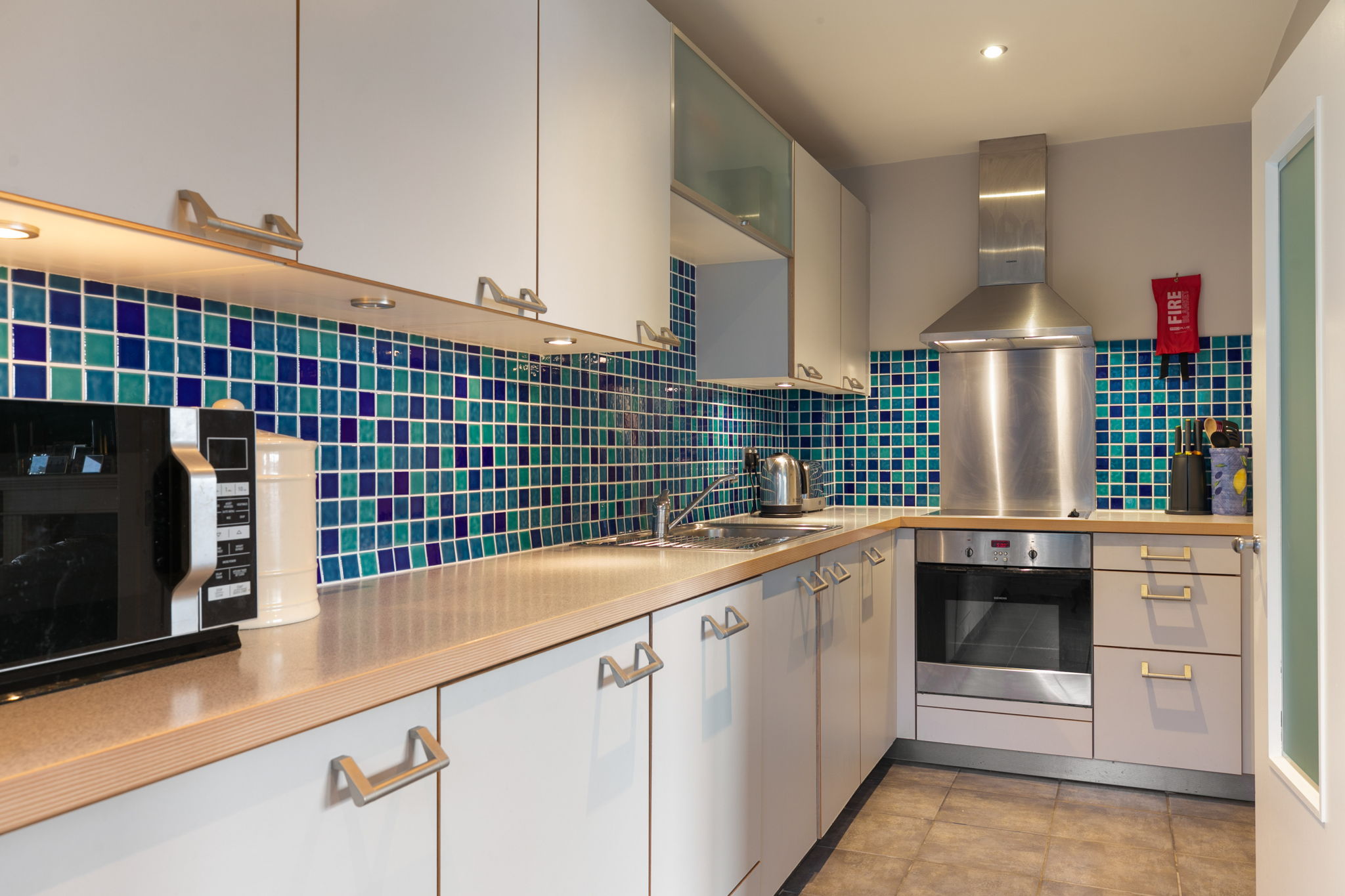 Fully fitted kitchen with range of overhead and floor level fitted units, tiled flooring and tiled backsplash. Electric Oven Hob & Extractor fan Sink unit, Dishwasher & Fridge Freezer