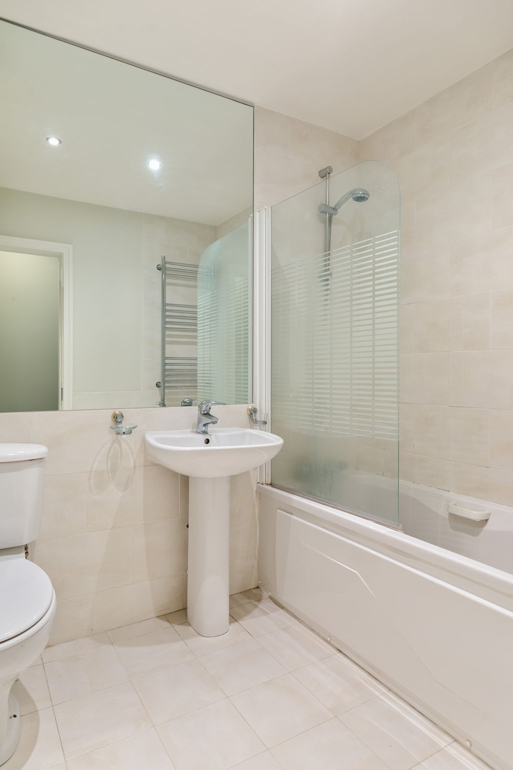 Bath with shower over Heated towel rail Sink unit w.c. and fully tiled